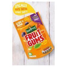 Fruit gums. Visit us at www.rowntrees.co.uk, www.facebook.com/rowntrees or www.twitter.com/rowntrees. A sharing bag of our fruity-flavoured gums,Now Vegan Friendly, for even more people to enjoy!,Satisfyingly chewy sweets, with a softer chew we know you’ll love,Blackcurrant, lemon, strawberry, lime and orange flavour,No artificial colours, flavours or preservatives